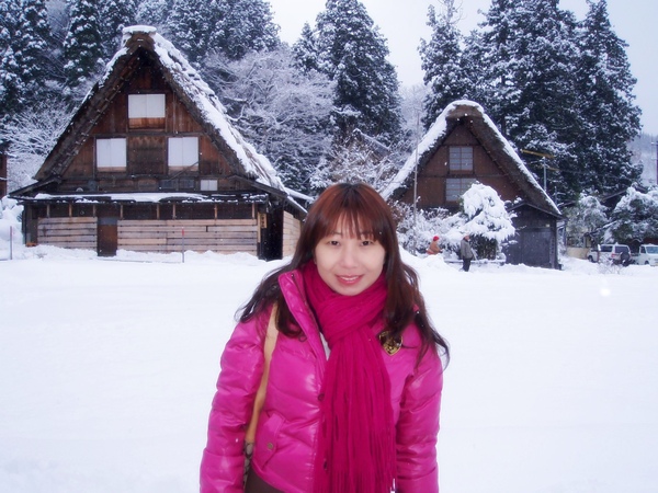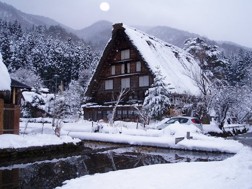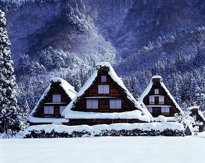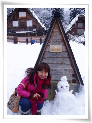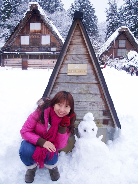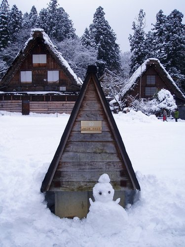 傳統木構的合掌屋披上一層厚厚的白棉被, 可愛得宛如童話中的薑餅屋。