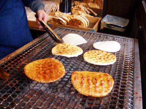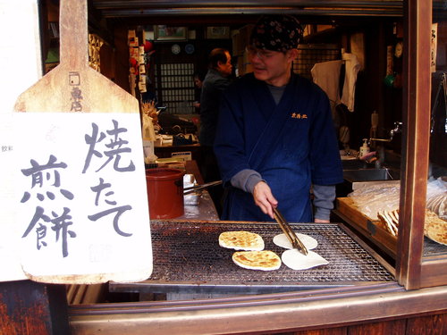 這裡著名的日式煎餅是現場烤的喔!上面塗上特調過的醬油,烤到酥酥脆脆,吃起來像米果,帶點醬油風味,越吃越香。