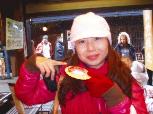 來到飛驒高山必吃的就是風味最佳的飛驒牛!肉質鮮嫩滑口無腥味,在日本知名度與松阪牛肉相當。這道飛驒牛握壽司你沒吃過吧!牛肉上塗一層類似照燒醬吧!味道挺不賴的!不過兩個就要日幣五百還真有點貴!不過那天又冷又餓,再加上超想吃看看傳說中的飛驒牛肉究竟啥滋味!(抱歉啦~焦距沒抓好有點濛!)